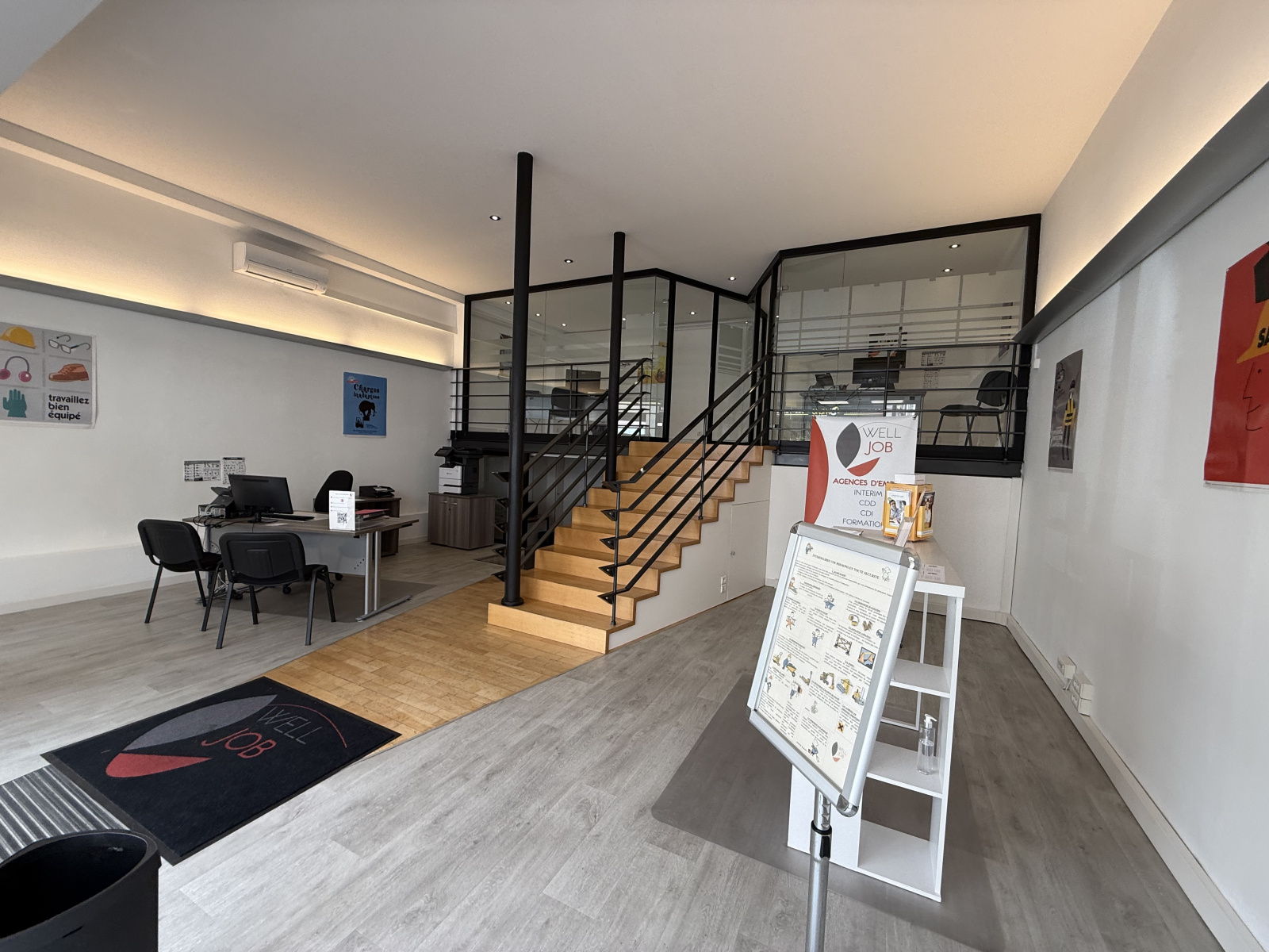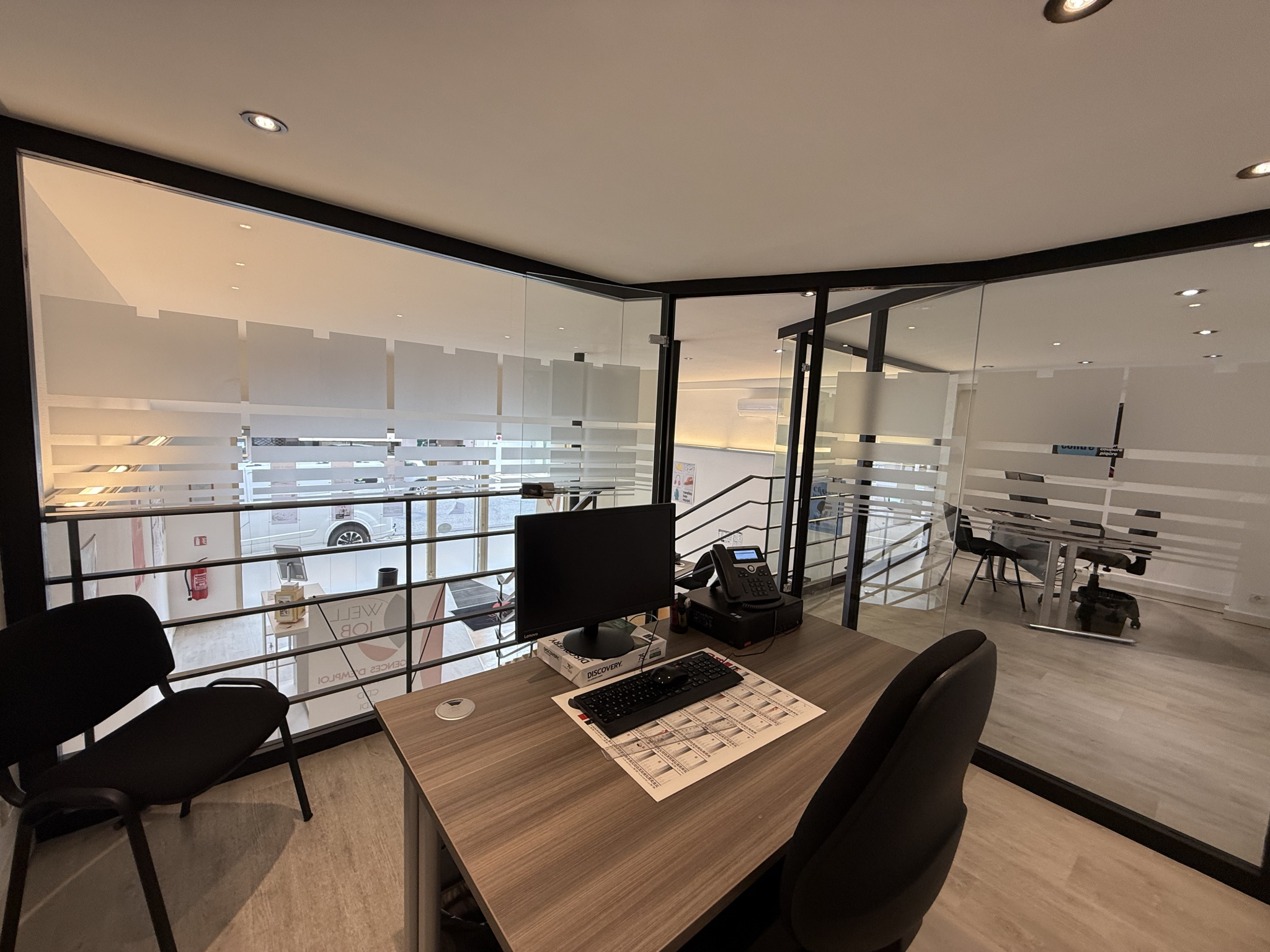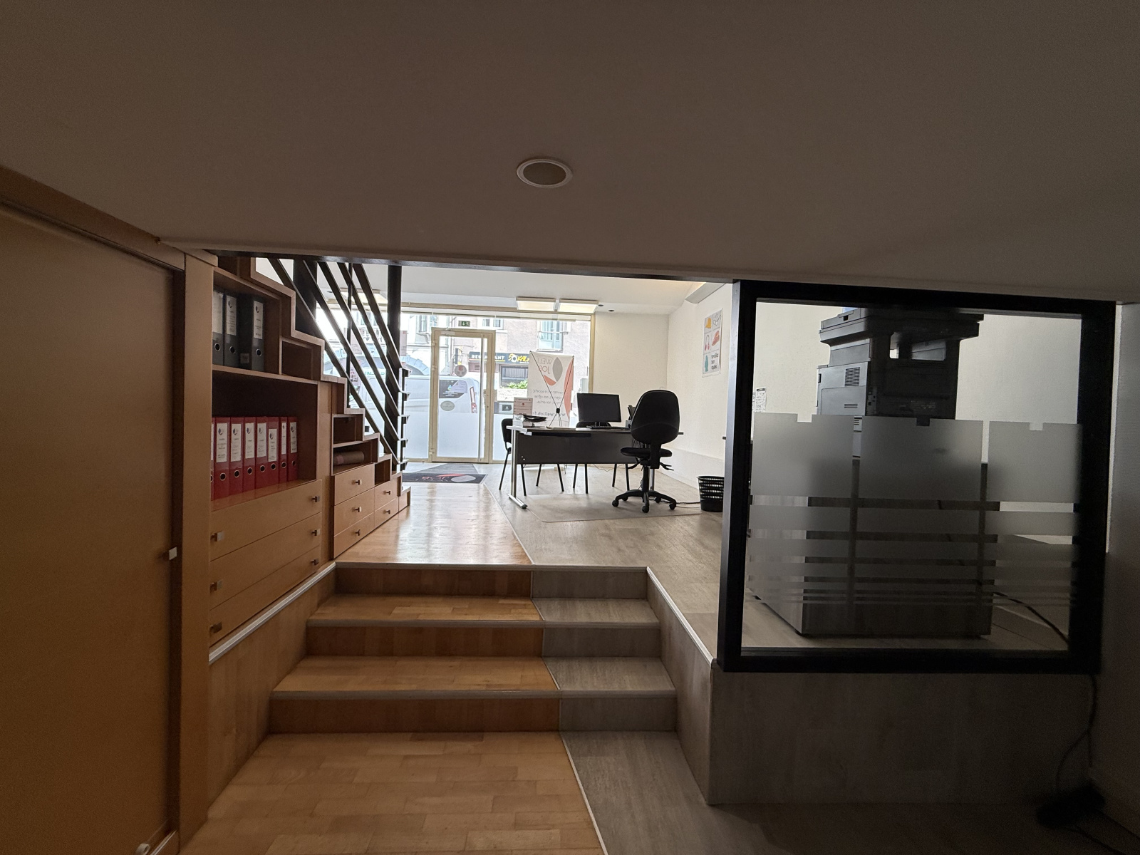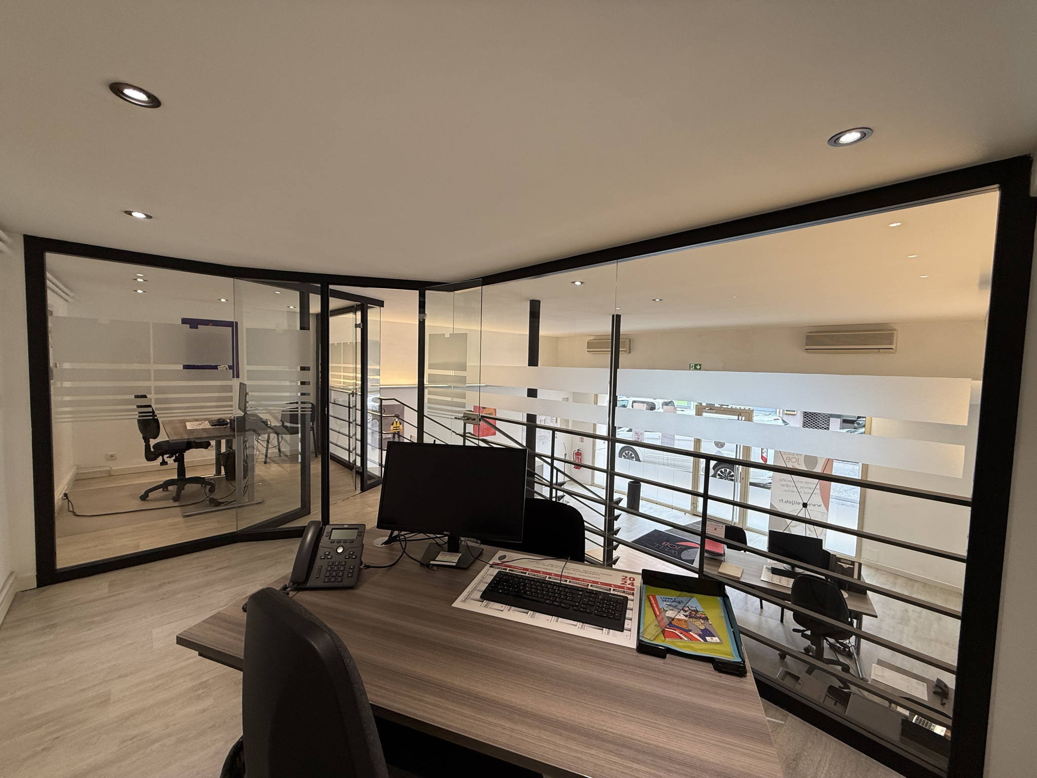 Il se compose d'un grand hall d'accueil,de deux bureaux en mezzanine ,d' un coin cuisine indépendant et d'un WC.